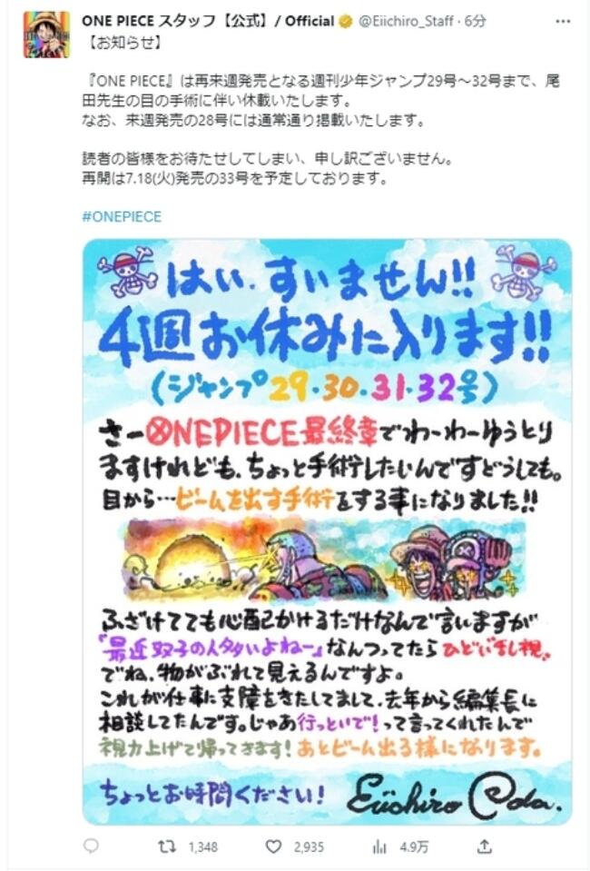 其官網還發布了尾田榮一郎在自己的手繪插畫上寫(xie) 的“請假條”。他表示:“非常抱歉,我將休息四周時間。《航海王》雖然已經進入終章,但由於(yu) 眼睛的散光很嚴(yan) 重,看東(dong) 西時出現重影,所以需要做個(ge) 手術。請給我一些時間(修養(yang) 一下)。”