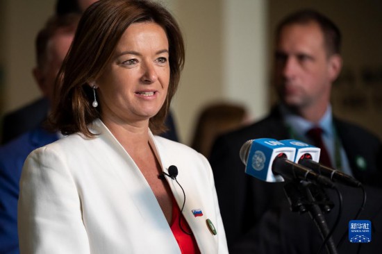 6月6日,在位於(yu) 紐約的聯合國總部,斯洛文尼亞(ya) 外長塔尼婭·法永在斯洛文尼亞(ya) 當選聯合國安理會(hui) 非常任理事國後在記者見麵會(hui) 上講話。新華社發(聯合國供圖/洛伊·費利佩攝)