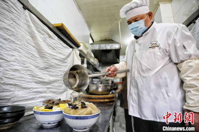 2023年2月,“四八席”廚師將熬好的老湯澆到每道菜上。 陳陽 攝