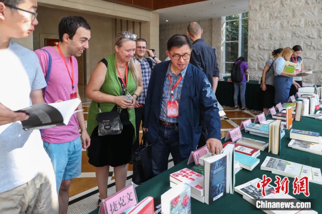 2018年,第五次漢學家文學翻譯國際研討會(hui) 在貴陽舉(ju) 行。圖為(wei) 研討會(hui) 上的翻譯作品展吸引海外翻譯家關(guan) 注。賀俊怡 攝