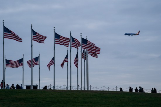 2022年11月10日,在美國首都華盛頓,一架飛機從(cong) 美國國旗上空飛過。新華社記者劉傑攝