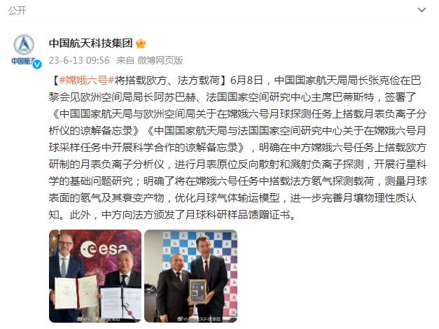 中新網6月13日電 據中國航天科技集團有限公司官方微博消息,6月8日,中國國家航天局局長張克儉(jian) 在巴黎會(hui) 見歐洲空間局局長阿蘇巴赫、法國國家空間研究中心主席巴蒂斯特,簽署了《中國國家航天局與(yu) 歐洲空間局關(guan) 於(yu) 在嫦娥六號月球探測任務上搭載月表負離子分析儀(yi) 的諒解備忘錄》《中國國家航天局與(yu) 法國國家空間研究中心關(guan) 於(yu) 在嫦娥六號月球采樣任務中開展科學合作的諒解備忘錄》,明確在中方嫦娥六號任務上搭載歐方研製的月表負離子分析儀(yi) ,進行月表原位反向散射和濺射負離子探測,開展行星科學的基礎問題研究;明確了將在嫦娥六號任務中搭載法方氡氣探測載荷,測量月球表麵的氡氣及其衰變產(chan) 物,優(you) 化月球氣體(ti) 輸運模型,進一步完善月壤物理性質認知。此外,中方向法方頒發了月球科研樣品饋贈證書(shu) 。
