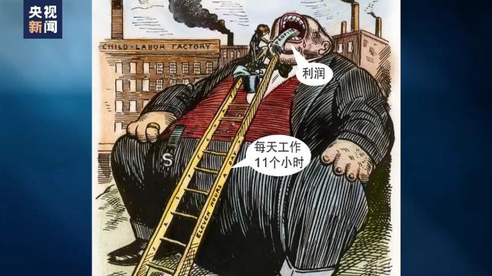 在這張漫畫中,一名瘦削的童工一天工作11個(ge) 小時,將利潤送進貪婪的雇主口中,將他們(men) 養(yang) 得腦滿腸肥。