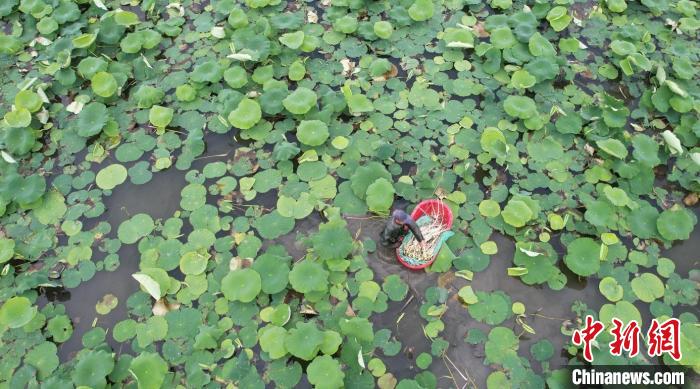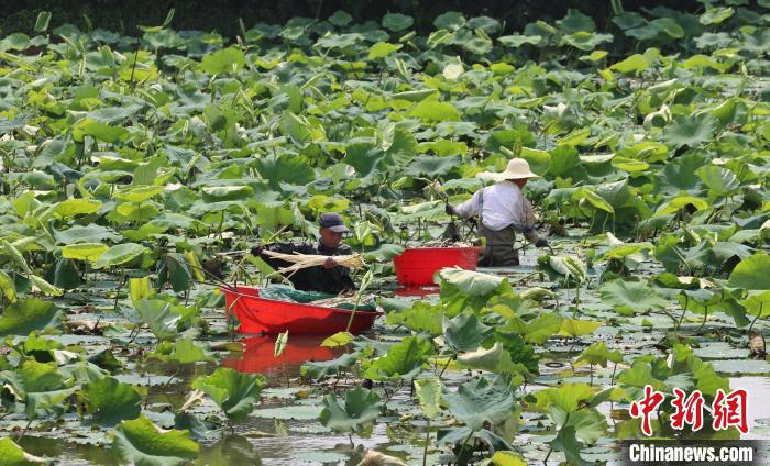 5月23日,武漢蔡甸藕農(nong) 正在荷塘裏“抽”藕帶。 中新社記者 張暢 攝