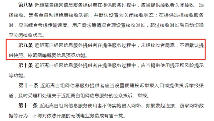 特別要注意的是,征求意見稿還提出“近距離自組網信息服務提供者在提供服務過程中,未經接收者同意,不得默認提供快照、縮略圖等概要信息預覽功能”。如前文所述,目前隔空投送存儲(chu) 失敗選擇使用“文件”打開時,在未完全接收的情況下可顯示信息縮略圖。