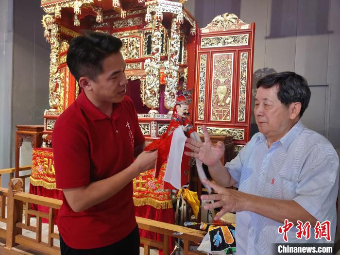 6月17日,在廈門舉(ju) 行的海峽兩(liang) 岸布袋木偶戲藝術節上,80歲的莊陳華(右一)正在指導吳聲傑(左一)表演布袋木偶戲。 中新社記者 葉秋雲(yun) 攝