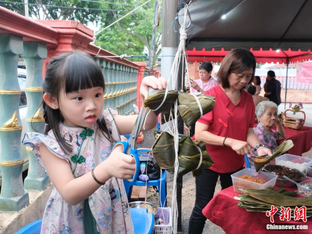 2023年6月18日,馬來西亞(ya) 馬六甲舉(ju) 行端午龍舟係列活動,包括遊龍舟、裹粽比賽等,吸引當地各族裔民眾(zhong) 參與(yu) 。圖為(wei) 有的家庭四代同堂齊上陣。奶奶在一旁包粽子,四歲的曾馨怡小朋友給包好的粽子修剪粽葉。陳悅 攝