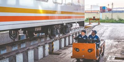 中國師父毛鑫(右)與(yu) 學員彼得·恩堅加在內(nei) 羅畢站區運轉車間內(nei) 調度車輛。