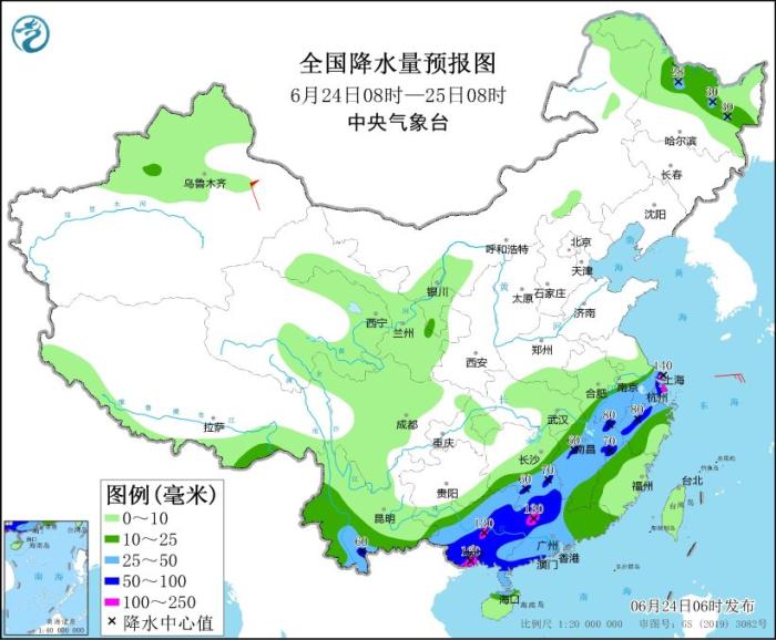 6月24日08時至25日08時,蘇皖南部、上海、浙江北部和西部、福建西北部、江西大部、湖南南部、廣西大部、廣東(dong) 中西部、雲(yun) 南南部等地部分地區有大到暴雨,其中,江蘇東(dong) 南部、上海東(dong) 部、廣西中部和南部沿海、廣東(dong) 北部等地局部地區有大暴雨(100~160毫米)。