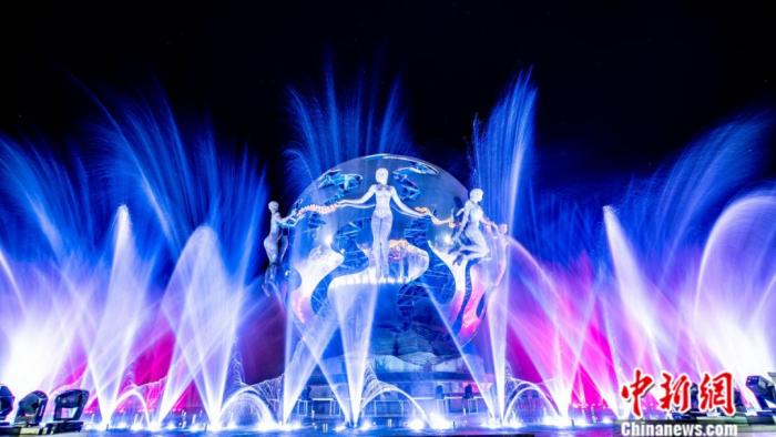 噴泉隨著音樂(le) 起伏翻飛、五彩繽紛