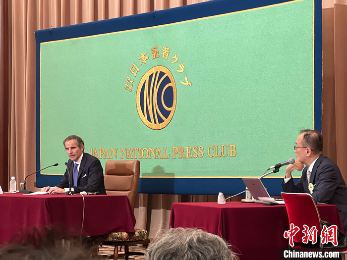 圖為(wei) 格羅西(左)在位於(yu) 日本東(dong) 京千代田區的日本記者俱樂(le) 部召開記者會(hui) 。 中新社記者 朱晨曦 攝