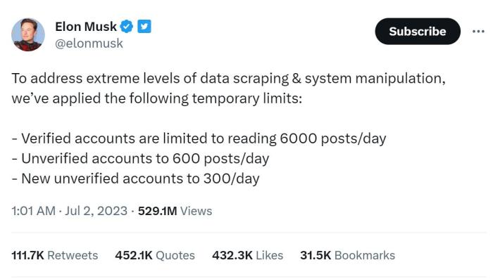 馬斯克發文稱,“為(wei) 了解決(jue) 極端水平的數據抓取和係統操縱問題,我們(men) 采取了以下臨(lin) 時限製:認證帳戶每天隻能閱讀6000個(ge) 帖子,未認證的帳戶每天能看600個(ge) 帖子;新的未認證的帳戶每天能看300個(ge) 帖子。”