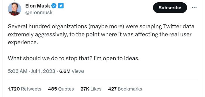 他還發布推文稱,數百個(ge) 甚至更多的組織正在“極其積極地”抓取推特數據,“這影響了真正的用戶體(ti) 驗”,但馬斯克尚未說明限製會(hui) 持續多久,也並未表示在什麽(me) 條件下將取消限製。
