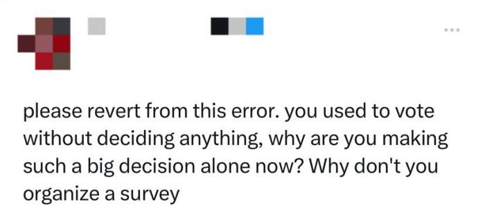 有網友呼籲,“請改正這個(ge) 錯誤。你以前在投票時都不做出任何決(jue) 定,為(wei) 什麽(me) 現在要獨自做出這麽(me) 大的決(jue) 定?你為(wei) 什麽(me) 不組織一次調查。”
