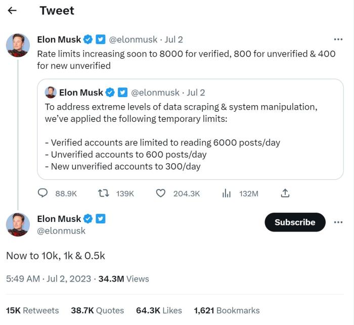 對此,馬斯克很快做出了反應。在宣布最初限製後僅(jin) 幾小時,他又發文稱,將限製提高到了已驗證賬戶8000條、未驗證賬戶800條、新的未驗證賬戶400條,並在當天再次將限製瀏覽量分別提高到了10000條、1000條和500條。