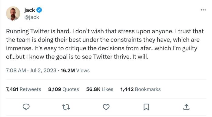 推特聯合創始人、前首席執行官傑克·多爾西隨後發表了對此事的看法,他表示,“運營推特是很困難的。我不希望任何人受到這種壓力。我相信這個(ge) 團隊在巨大的限製條件下,正在盡最大努力。從(cong) 遠處批評這些決(jue) 定是很容易的……我也對此感到歉疚……但我知道他們(men) 的目標是要看到推特的繁榮。它會(hui) 的。”