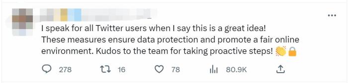 但也有網友對此表示歡迎,表示“我代表所有的推特用戶聲明,這是一個(ge) 好主意!這些措施能確保數據得到保護,同時促進公平的網絡環境。感謝團隊采取積極措施。”