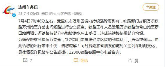 中新網7月4日電 據成都鐵路局達州車務段官方微博消息,7月4日7時48分左右,受重慶市萬(wan) 州區境內(nei) 持續強降雨影響,鐵路部門封鎖萬(wan) 涼鐵路萬(wan) 州站至齊嶽山間線路進行安全巡查。鐵路工作人員發現萬(wan) 涼鐵路魚背山站至羅田站間駟步河鐵路橋部分橋墩被洪水衝(chong) 擊受損,造成該鐵路橋梁部分垮塌。為(wei) 確保旅客列車運行安全,鐵路部門安排途經該區段的列車迂回、折返或停運。