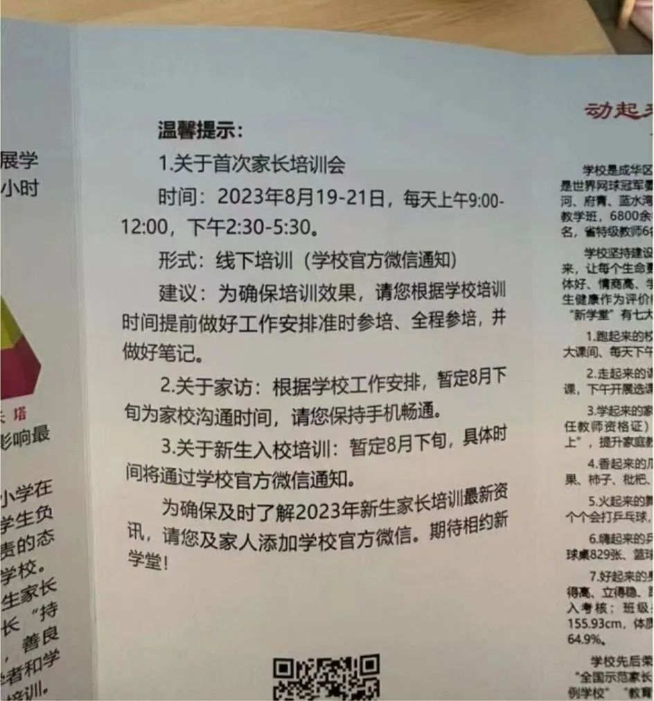 這則通知書(shu) 是發給成都某小學2023級新生家長的,包含了寫(xie) 給家長的一封信、學校簡介、學校的教育理想等內(nei) 容,其中,引發家長們(men) 熱議的,是在通知書(shu) 的溫馨提示部分,家長們(men) 被告知:學校將在8月19日到21日舉(ju) 行首次家長培訓會(hui) ,形式為(wei) 線下,時間為(wei) 三個(ge) 全天。