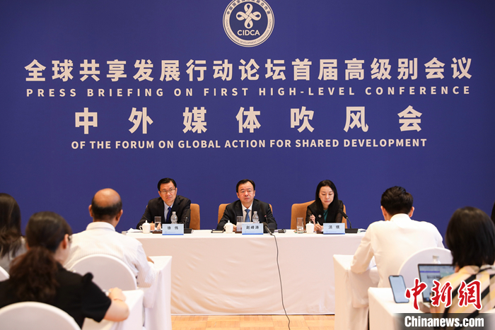 7月4日,全球共享發展行動論壇首屆高級別會(hui) 議中外媒體(ti) 吹風會(hui) 在北京舉(ju) 行。針對有觀點認為(wei) 西方國家與(yu) 發展中國家看待全球發展倡議的視角不同,對全球發展倡議的評價(jia) 也不同,中國國家國際發展合作署副署長趙峰濤(中)在北京回應指出,全球發展倡議麵向全球,無分南北。倡議是開放、包容的,不能用狹隘的地緣政治、冷戰思維、陣營對抗理念來解讀。 中新社記者 趙雋 攝