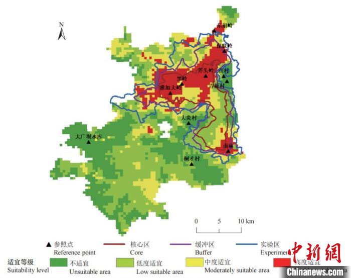 圖為(wei) 科學家繪製出的海南霸王嶺一帶適合海南長臂猿棲息的區位圖。(許涵供圖)