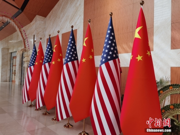 2022年11月,中美兩(liang) 國元首在印尼巴厘島舉(ju) 行會(hui) 晤。圖為(wei) 會(hui) 場外擺放的中美兩(liang) 國國旗。 郭金超 攝