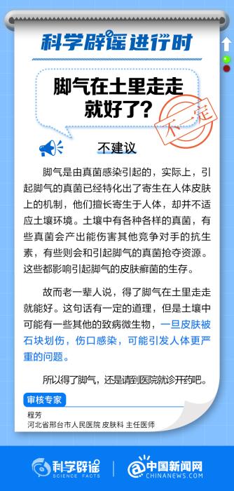 老一輩人說,得了腳氣在土裏走走就能好。這句話有一定的道理,但是土壤中可能有一些其他的致病微生物,一旦皮膚被石塊劃傷(shang) ,傷(shang) 口感染,可能引發人體(ti) 更嚴(yan) 重的問題。所以得了腳氣,還是請到醫院就診開藥吧。(來源:科學辟謠、中國新聞網微博)