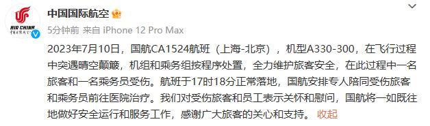 事後,據國航回應,在此過程中一名旅客和一名乘務員受傷(shang) 。航班於(yu) 17時18分正常落地,國航安排專(zhuan) 人陪同受傷(shang) 旅客和乘務員前往醫院治療。
