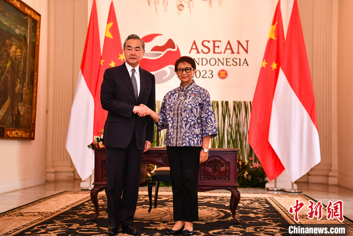 當地時間7月12日,中央外辦主任王毅在雅加達會(hui) 見印尼外長蕾特諾。 中新社發 徐欽 攝