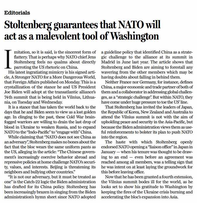 在所有成員國尚未達成協議之前,斯托爾滕貝格在1月份就公開表態,支持北約在日本設立“聯絡處”,其險惡用心可見一斑。現在,隨著他在華盛頓支持下第四次延任,北約峰會(hui) 對世界來說更是一個(ge) 壞兆頭,因為(wei) 他似乎準備讓烏(wu) 克蘭(lan) 危機之火繼續燃燒,並加速北約向亞(ya) 洲擴張,以表達對華盛頓的忠誠與(yu) 感激之情。