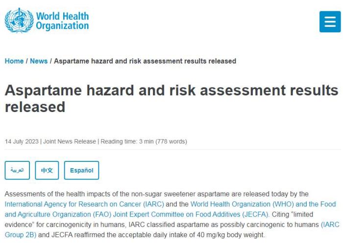 近期以來,“阿斯巴甜致癌”爭(zheng) 議引起廣泛關(guan) 注。14日,世衛組織官網上發布消息,國際癌症研究機構(IARC)、世界衛生組織和聯合國糧食及農(nong) 業(ye) 組織(FAO)食品添加劑聯合專(zhuan) 家委員會(hui) (JECFA)發布了阿斯巴甜對健康影響的評估結果。