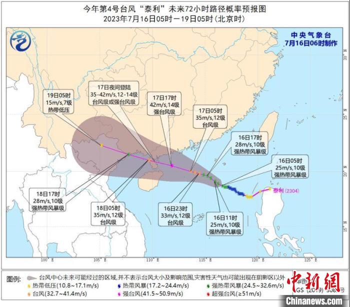 海南省氣象台預計,“泰利”中心將以每小時15公裏左右的速度向西北方向移動,強度繼續增強,並於(yu) 17日夜間在海南文昌到廣東(dong) 台山一帶沿海登陸(台風級或強台風級,35~42米/秒,12~14級),之後於(yu) 18日進入北部灣,以後趨向越南北部沿海和廣西沿海。