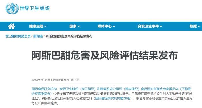 根據世界衛生組織官網消息,國際癌症研究機構(IARC)、世界衛生組織(WHO)和糧食及農(nong) 業(ye) 組織(FAO)、食品添加劑聯合專(zhuan) 家委員會(hui) (JECFA)發布了對甜味劑阿斯巴甜健康影響的評估。