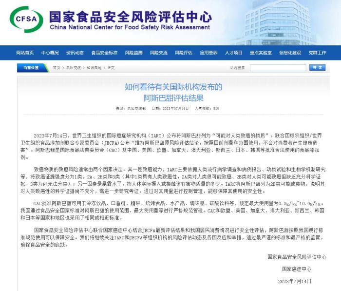 文章稱,國家食品安全風險評估中心聯合國家癌症中心結合JECFA最新評估結果和我國居民消費情況進行安全性評估,阿斯巴甜按照我國現行標準規範使用可以保障安全。“我們(men) 將繼續關(guan) 注IARC和JECFA等組織機構的風險評估動態及各國反應和舉(ju) 措,通過最嚴(yan) 謹的標準和最嚴(yan) 格的監管,確保食品安全的底線。”(完)