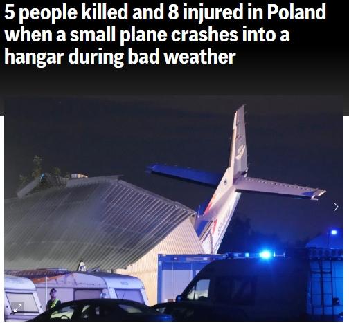 據報道,當天,波蘭(lan) 國家消防局發言人莫妮卡·諾瓦科斯卡·布林達(Monika Nowakowska-Brynda)表示,“波蘭(lan) 中部的克辛諾(Chrcynno)地區,受惡劣天氣影響,一架塞斯納型飛機在降落時墜入跳傘(san) 中心的機庫,事發時有10人在機庫中,飛行員和在機庫中躲避暴風雨天氣的4名人員遇難。”
