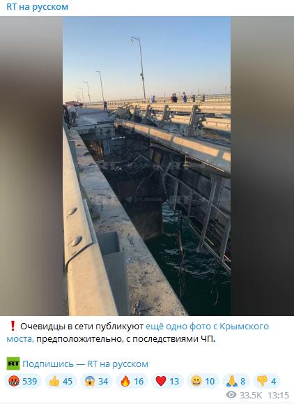 俄媒“今日俄羅斯”(RT)發布了據稱是目擊者在克裏米亞(ya) 大橋事件後拍攝的大橋圖片。圖片來源:RT社交媒體(ti) 截圖