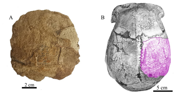 周口店第15號地點發現的人類頂骨化石。左側(ce) :頂骨化石外側(ce) 麵觀;右側(ce) :周口店直立人頭蓋骨模型頂麵觀,示頂骨化石位置。圖片來源:中國科學院官網