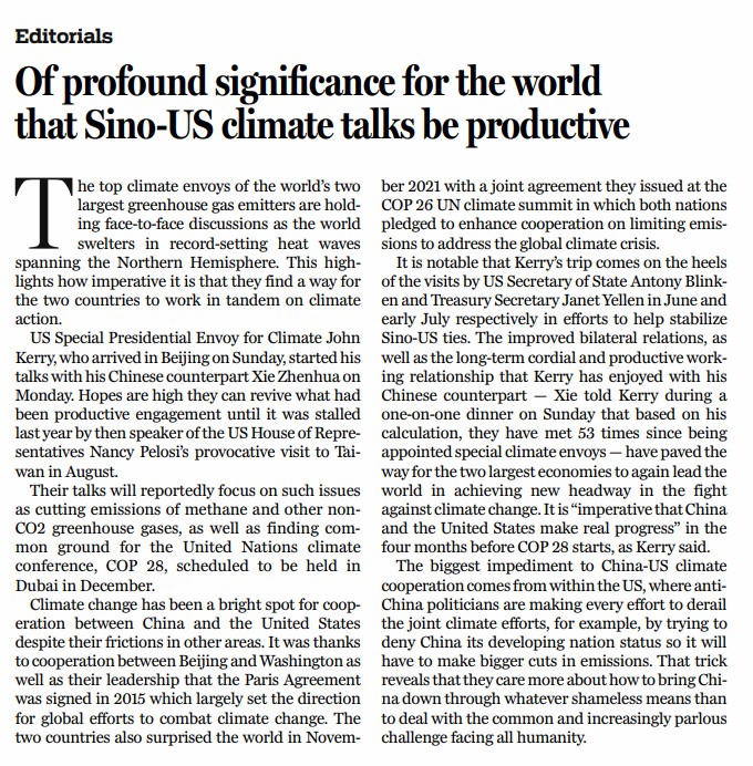 在舉(ju) 世關(guan) 注中,世界最大的兩(liang) 個(ge) 經濟體(ti) 的氣候特使舉(ju) 行了麵對麵會(hui) 談。當前,北半球正在經曆創紀錄的熱浪,凸顯了中美在氣候問題上攜手合作多麽(me) 重要。