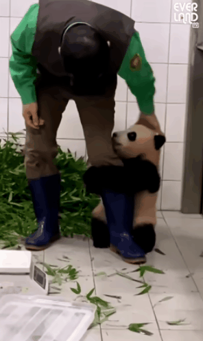 “福寶”抱著飼養(yang) 員的腿撒嬌。(來源:愛寶樂(le) 園官方社交平台賬號)