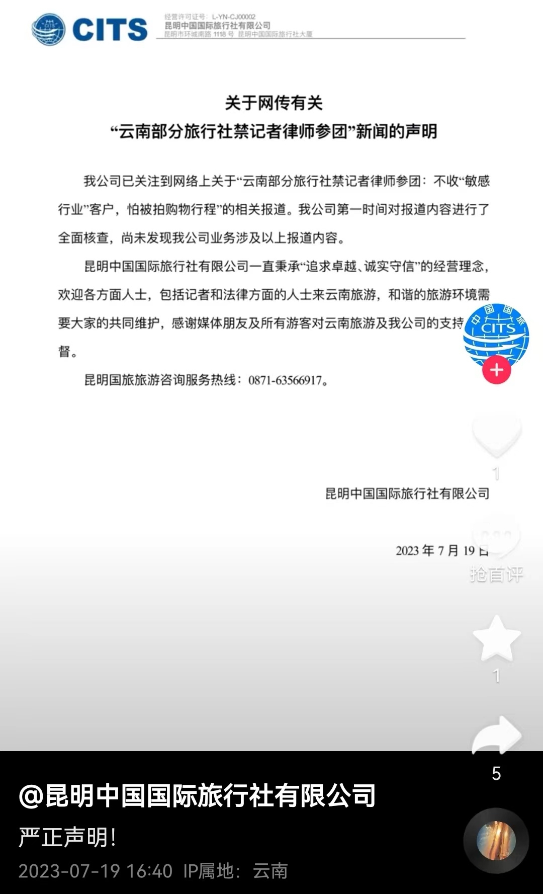 昆明中國國際旅行社在抖音上發布聲明。
