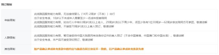 19日,記者瀏覽某在線旅遊平台的多個(ge) 跟團遊頁麵,發現在預訂限製一欄中,會(hui) 有年齡限製、人群限製和其他限製。但多是不接受孕婦預訂,並未有記者等職業(ye) 限製。