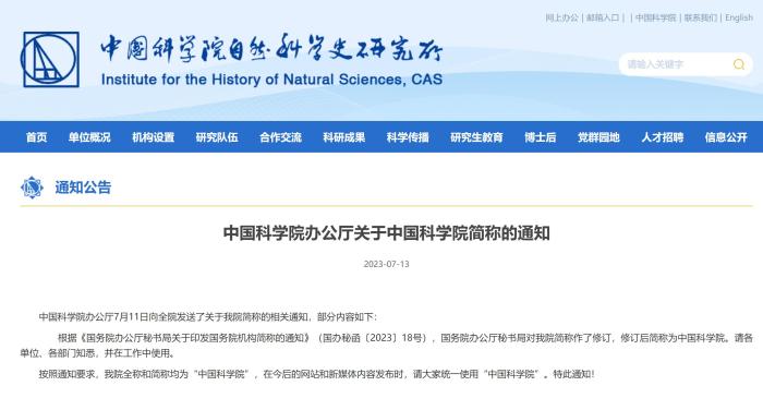 據中國科學院自然科學史研究所網站發布的消息,中國科學院辦公廳7月11日發布了關(guan) 於(yu) 中國科學院簡稱的相關(guan) 通知,部分內(nei) 容如下: