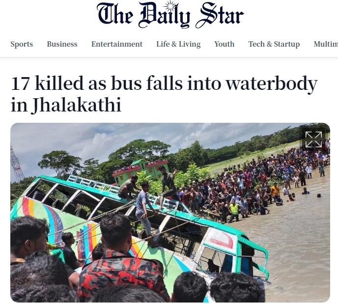 據報道,當地時間22日上午約9:45分,在達卡以南約200公裏的恰洛加蒂縣,一輛大巴掉入水中。當地警方稱,死者中包括至少8名婦女和3名兒(er) 童。