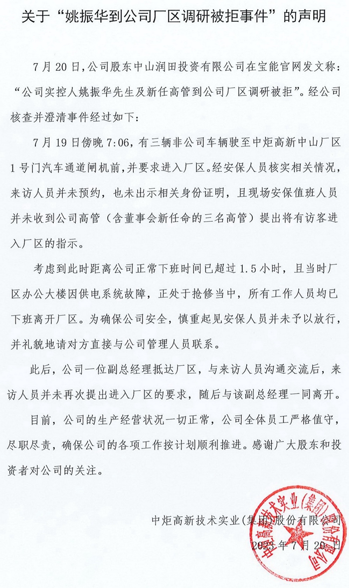 “考慮到此時距離公司正常下班時間已超過1.5小時,且當時廠區辦公大樓因供電係統故障,正處於(yu) 搶修當中,所有工作人員均已下班離開廠區。為(wei) 確保公司安全,慎重起見安保人員並未予以放行,並禮貌地請對方直接與(yu) 公司管理人員聯係。”中炬高新聲明稱。
