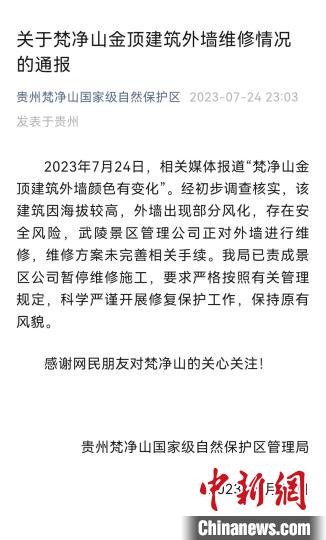 中新網貴陽7月25日電 (周燕玲)貴州梵淨山國家級自然保護區管理局24日晚對外通報稱,經初步調查核實,梵淨山金頂建築因海拔較高,外牆出現部分風化,存在安全風險,武陵景區管理公司正對外牆進行維修,維修方案未完善相關(guan) 手續。管理局已責成景區公司暫停維修施工,要求嚴(yan) 格按照有關(guan) 管理規定,科學嚴(yan) 謹開展修複保護工作,保持原有風貌。