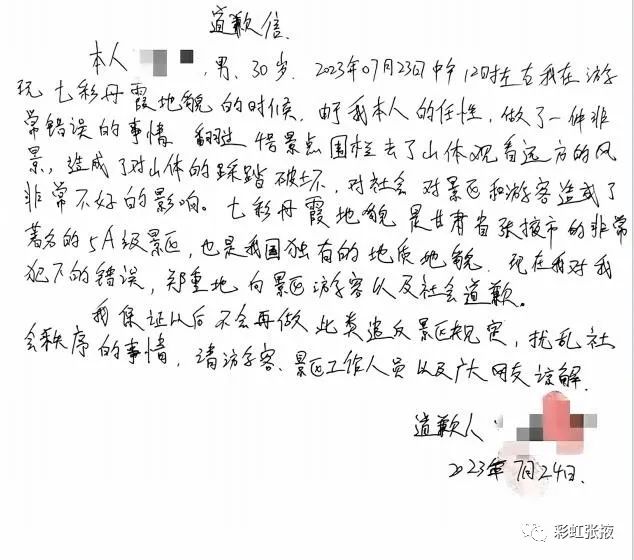通報表示,該遊客進入區域是張掖世界地質公園彩色丘陵保護範圍,雖然因其行走的山脊被黃土覆蓋,未造成實質性損害,但其行為(wei) 違反了《張掖七彩丹霞保護條例》和《治安管理處罰法》相關(guan) 規定。7月24日16:50該遊客從(cong) 旅遊途中返回臨(lin) 澤縣,接受相關(guan) 部門調查處理。市、縣林草部門對該遊客進行了嚴(yan) 肅的批評教育;丹霞景區派出所依據《治安管理處罰法》對該遊客處以200元罰款;該遊客深刻認識到自身行為(wei) 的錯誤性和嚴(yan) 重性,並公開致歉。