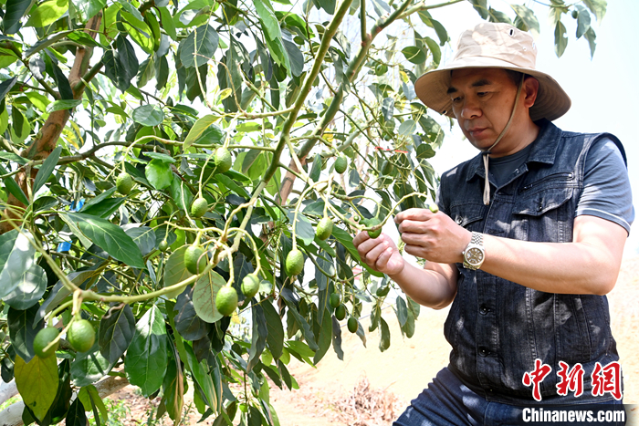 圖為(wei) 4月27日,汪誌哲檢查牛油果長勢。 中新社記者 李嘉嫻 攝