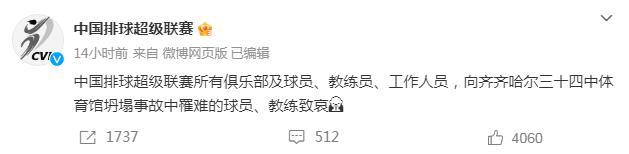 中新網7月25日電 據中國排球超級聯賽官微25日消息,中國排球超級聯賽所有俱樂(le) 部及球員、教練員、工作人員,向齊齊哈爾三十四中體(ti) 育館坍塌事故中罹難的球員、教練致哀。