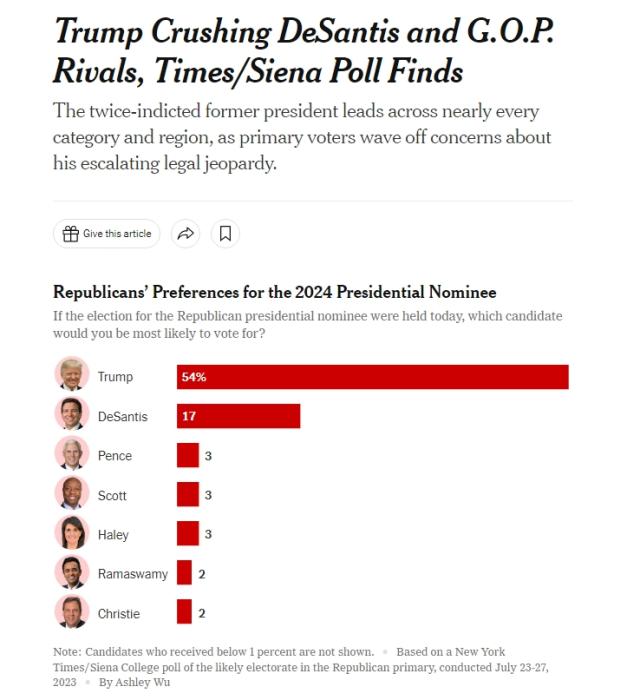 中新網7月31日電 據《紐約時報》報道,《紐約時報》和錫耶納學院31日公布了一項針對共和黨(dang) 選民的聯合民意調查結果:在所有的共和黨(dang) 總統競選人中,特朗普以54%的支持率取得絕對領先地位,超出第二位德桑蒂斯37%,其餘(yu) 候選人支持率均未超過3%。