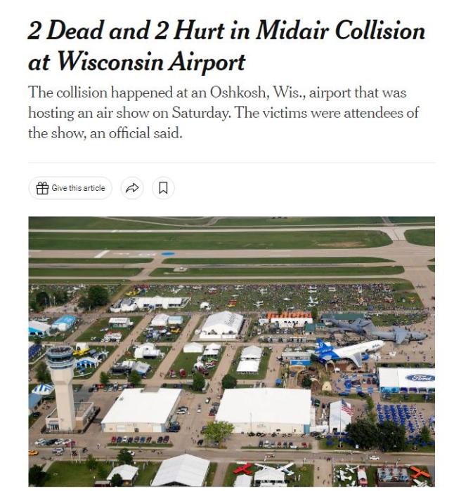 據《紐約時報》報道,美國聯邦航空管理局(FAA)稱,事故發生在威斯康星州奧什科什的惠特曼地區機場。在為(wei) 期一周的活動中,“實驗飛機協會(hui) ”在此舉(ju) 辦飛行表演和航展。